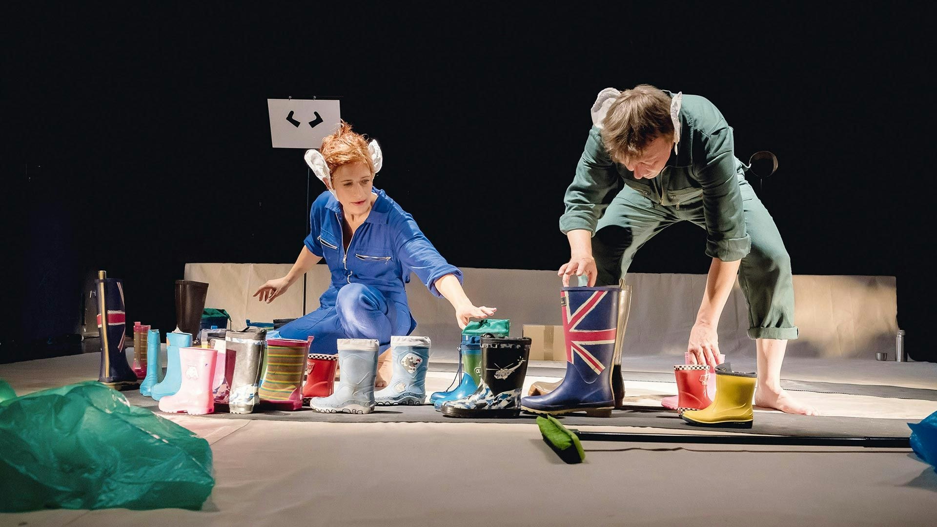 Ein eigentümlicher, schwarz-weisser Raum mit Dingen drin. Lieber nichts anfassen! Ist vielleicht Kunst! Doch die zwei Gestalten, die den Raum betreten, finden alles interessant. Mal durchgehen. Mal anschauen. Mal anfassen. Mal zuhören… Und plötzlich beginnt Musik - ungewohnte Musik: kleine Stücke Minimal Music von Steve Reich und Terry Riley erklingen und führen zu ganz verschiedenen Spielszenen. Vögel klappern ihren Rhythmus, Gummistiefeltiere versammeln sich um ein Wasserloch, der Raum verändert sich und mit ihm die beiden Akteure darin.